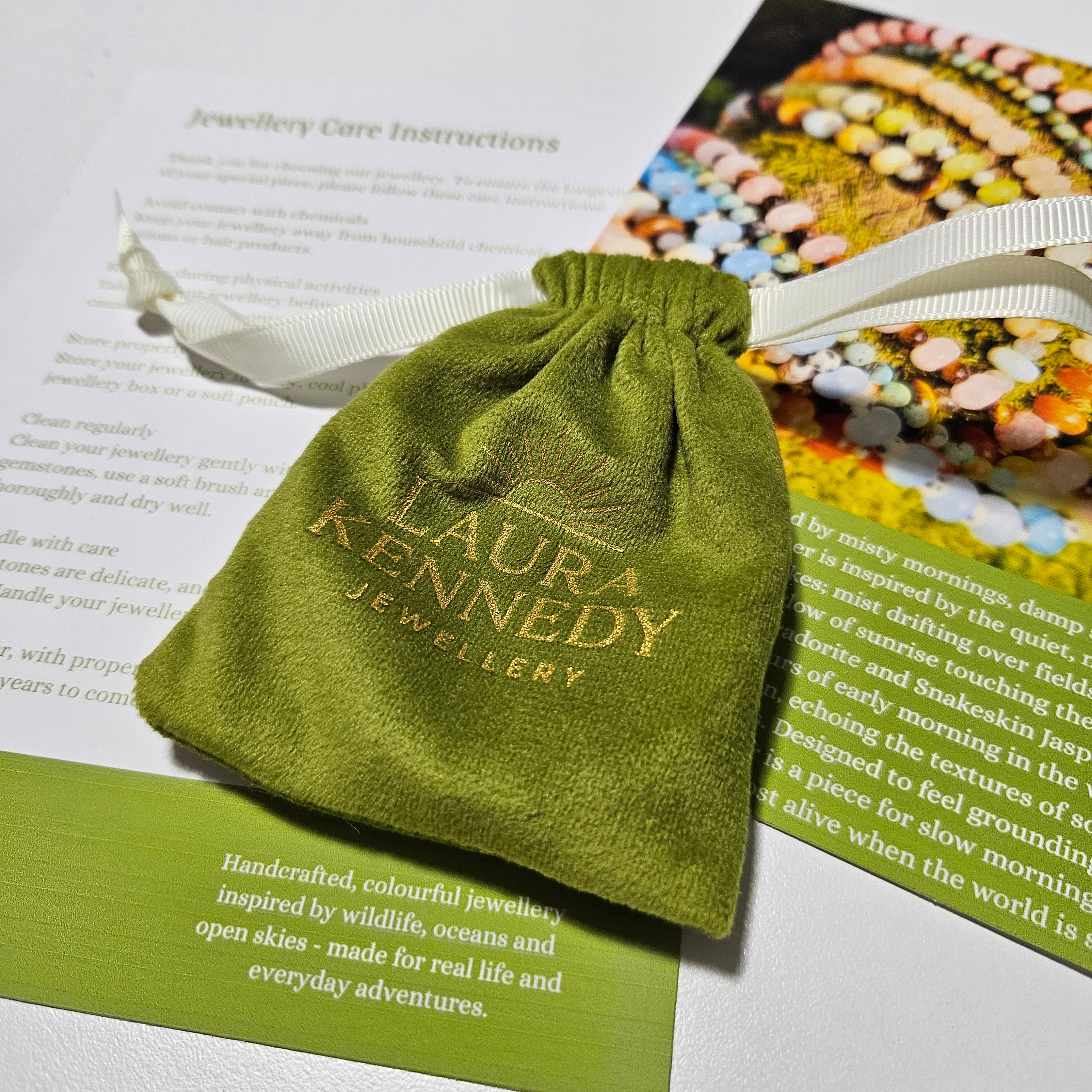 Reed is inspired by still mornings at the water’s edge — tall grasses moving gently in the breeze, mirror-like pools, and the slow, elegant steps of wading birds. This bead necklace brings together semi-precious gemstones and glass beads in a palette drawn from wetlands: soft greens, misty blues and earthy tones.